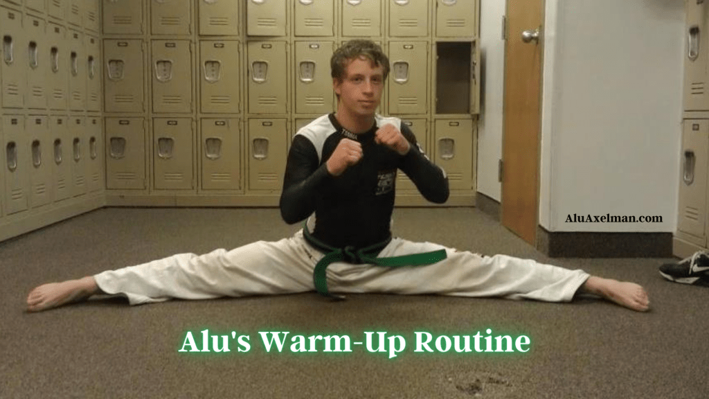 At this point, I feel that my joints are loose enough to begin putting a little more stress on them, so I transition to dynamic stretching. I do some half-power front kicks, ideally on a heavy bag. Then comes high risking kicks (dynamic hamstring stretch) and then round kicks and hook kicks. I mix in some jogging back and forth in the gym between kicking sets. The running speed increases each time until I am sprinting at 100% speed. I also mix in alternating lunges and lateral bending of the torso while doing the dynamic warmup. As I reach 100% intensity on the sprints and the kicks and I move to jumping lunges or jump-squats, I begin to do some static stretching: straddle, splits, glutes, shoulders, back, quads, and calves. I finish off my warmup with the rowing machine, a set of pushups, or a light round of boxing on the heavy bag.